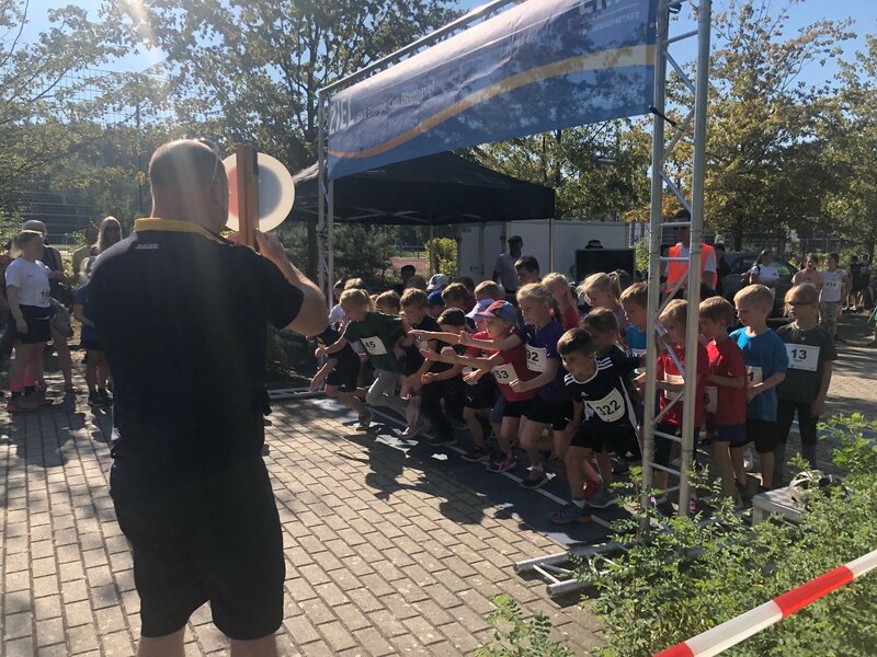 Bild 1+2: Rund 60 Kinder unter 8 Jahren starteten bei den 400- und 800-Meter-Läufen. Bürgermeister Stephan Zimniok gab das Startsignal.