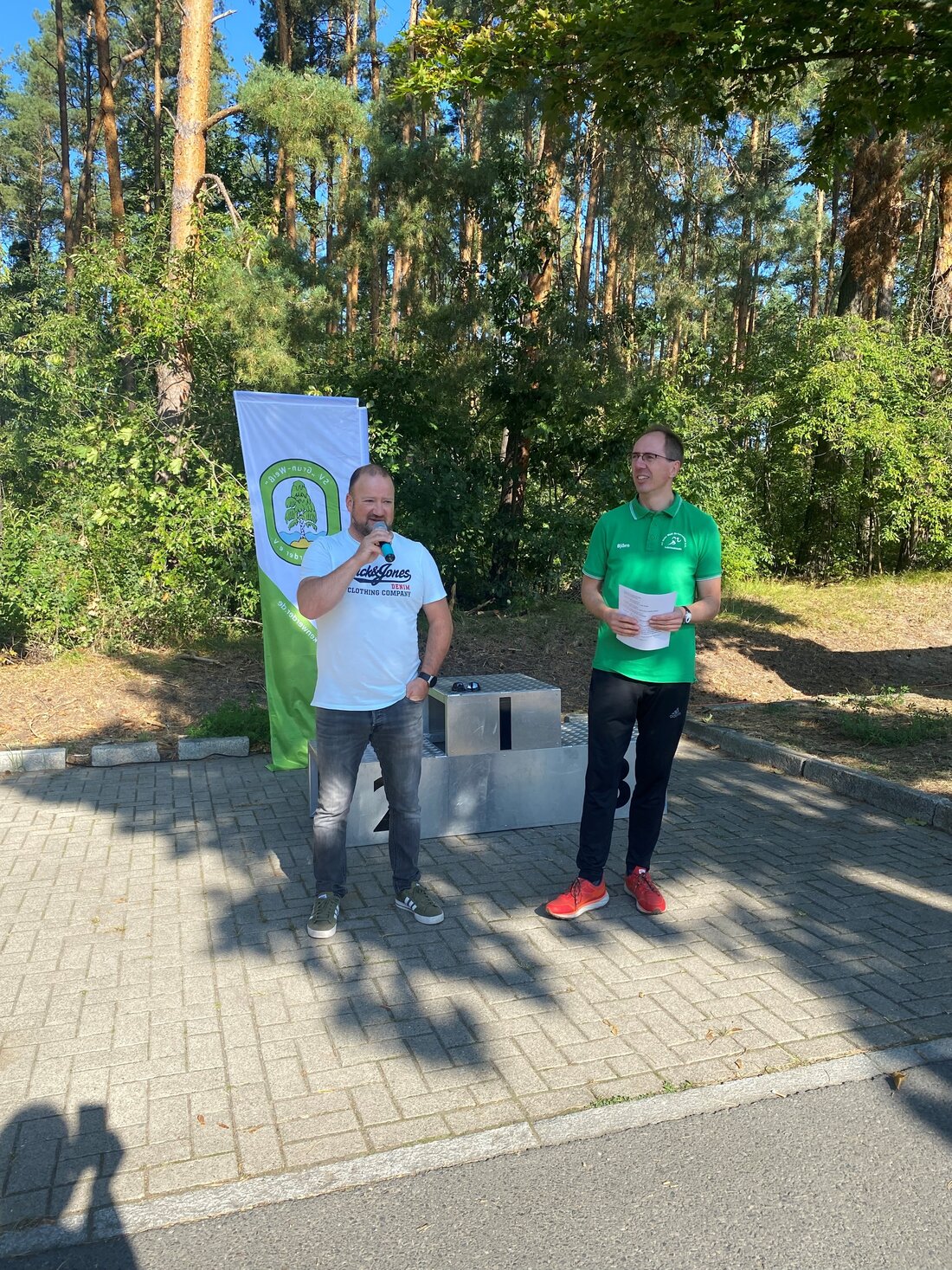 Bild 1: Bürgermeister Stephan Zimniok und Björn Becke, 1. Vorsitzender des SV Grün- Weiß Birkenwerder, begrüßen die Besucher und Besucherinnen.
