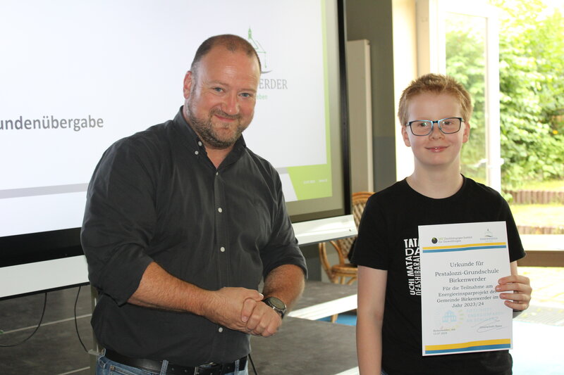 Bild 1: Mika Wolff nimmt die Urkunde für die Pestalozzi-Grundschule von Bürgermeister Stephan Zimniok entgegen.