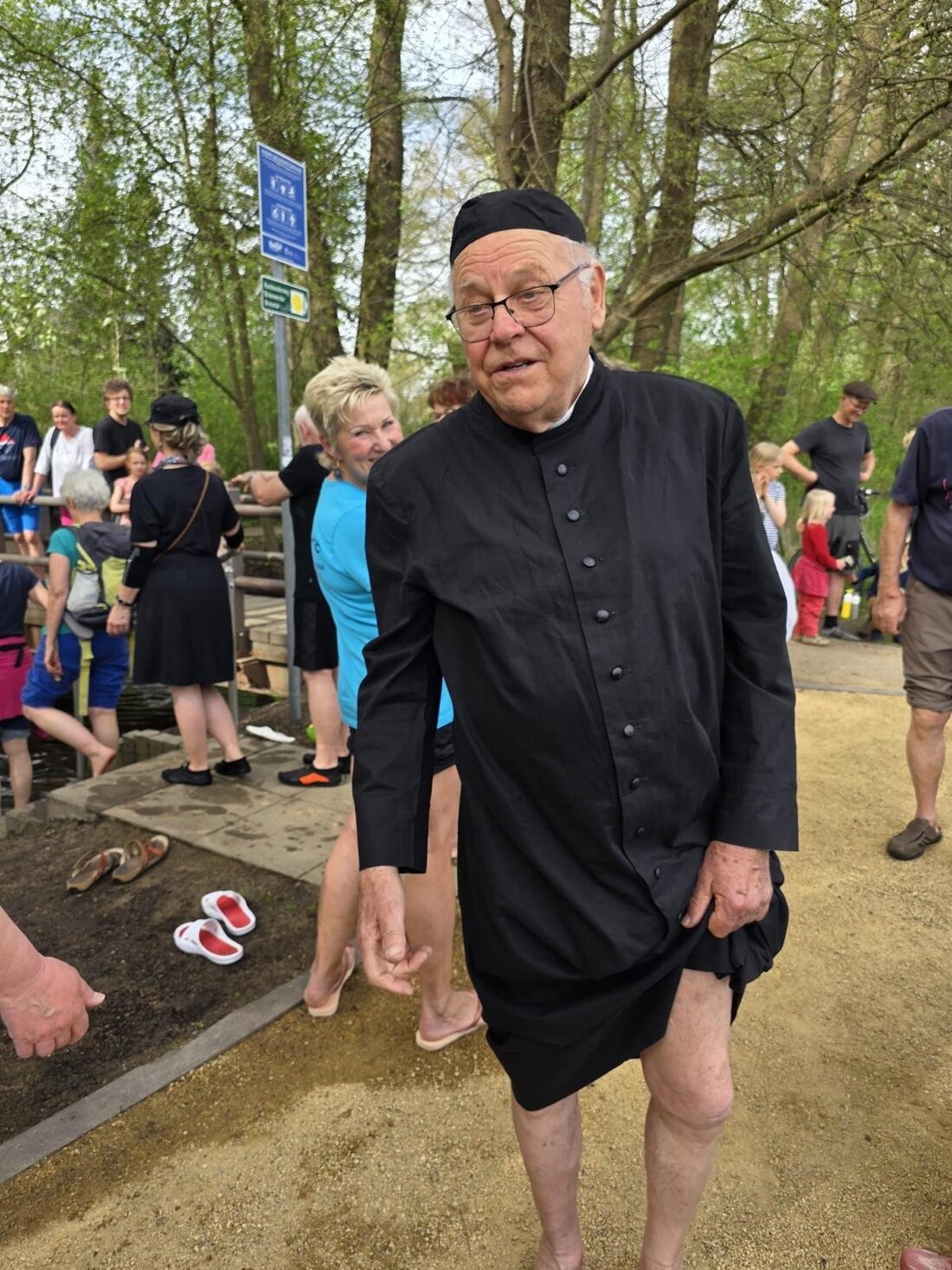 Das "Ankneippen" an der Wassertretanlage in Birkenwerder ist eine beliebte Tradition, die auch am Gründonnerstag 2025 wieder gut besucht war. Etwa 80 Unentwegte folgten dem Aufruf der Organisatoren aus der Physiotherapiepraxis von Diana Rohner. Gut gelaunt wateten die Teilnehmer durch das 18 Grad kalte Briesewasser. Das stoische Gehen durchs kühle Wasser ist nicht nur erfrischend, sondern auch förderlich für die Gesundheit, wie schon der Priester und Naturheilkundler Sebastian Kneipp wusste. Als Erfinder des Kneippens verkleidet sprach Bernd Erzmann in seiner Predigt von den Vorteilen dieses alten Brauchs. Eine der Weisheiten lautet: „Was heilbar ist, das heilt das Wasser!" Regelmäßige Bewegung sei sehr wichtig, denn: „Wer rastet, der rostet!" Erzmann erinnerte auch daran, dass Kneipp zu seiner Zeit – er lebte von 1821 bis 1897 – von Medizinern als „Quacksalber“ verunglimpft wurde. Für alle, die sich nach dem kurzen Fußbad wieder aufwärmen wollten, wurde heißer Tee ausgeschenkt. Dazu gab es kleine Häppchen. Die Phönix Hauskrankenpflege Birkenwerder steuerte selbst gebackenen Kuchen bei. In diesem Jahr gab es auch wieder eine musikalische Begleitung mit dem Dudelsack. Diana Rohner initiiert das jährlich stattfindende An- und Abkneippen gemeinsam mit Bernd Erzmann seit 2021, nachdem sich der Handel- und Gewerbetreff (HGT) aufgelöst hatte. Zuvor hatte sie mit ihrem Team bereits die Gymnastikübungen vor dem gemeinsamen Wassertreten geleitet und war selbst Mitglied im HGT. Die Wassertretanlage wurde auf Initiative des Handel- und Gewerbetreffs gebaut und 2008 eingeweiht.