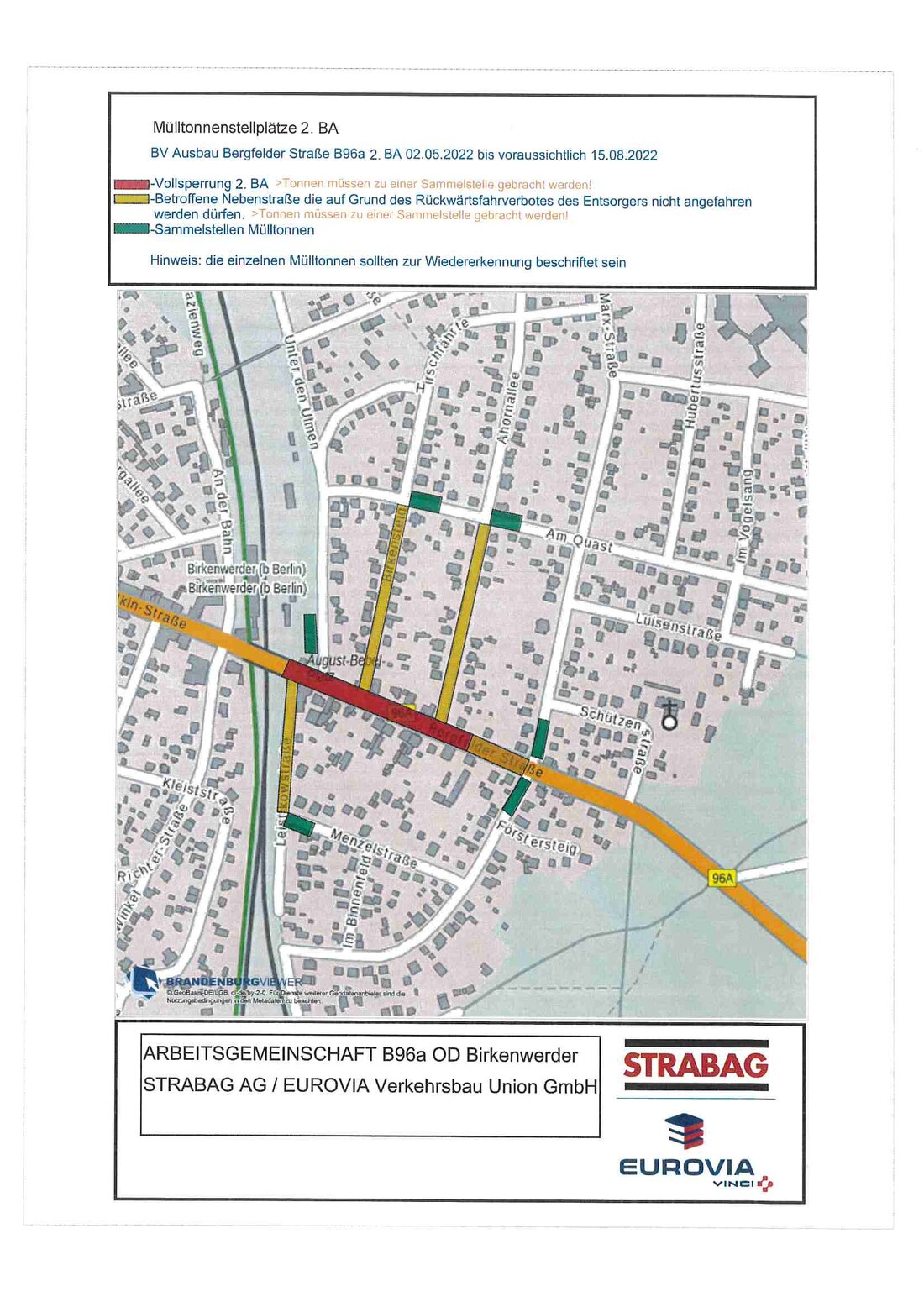 Am 29.04.2022, 07:30 Uhr beginnen wir mit vorbereitenden Arbeiten der Baustelle und am 02.05.2022 mit den Bauarbeiten im Bereich zwischen der S-Bahnbrücke und der Ahornallee. Die Straße wird hier während der Bauzeit voll gesperrt sein. ln Abhängigkeit evtl. Widrigkeiten werden die Arbeiten in diesem Bereich voraussichtlich in der 32./33.- KW 2022 (Mitte August) beenden. ln diesen Zeiten ist die Ein- u. Ausfahrt zu Ihren Grundstücken in der Planung der Verkehrsführung nicht uneingeschränkt vorgesehen und kann nur in Ausnahmefällen ermöglicht werden. Wir bitten Sie daher ihr Fahrzeug in dieser Zeit außerhalb des Baubereiches zu Parken. ln dieser Zeit bitten wir Sie Ihre Mülltonnen zu den, in den beiligenden Skizzen markierten Sammelstellen zur Abholung zu bringen. Sind Sie gesundheitlich dazu nicht in der Lage, sind unsere Kollegen gerne bereit Ihnen dabei behilflich zu sein.