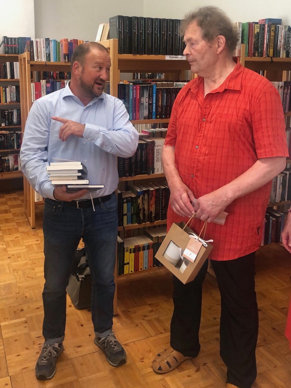 Damit die Bücher von vielen gelesen werden können, schlug Leverenz’ Schulfreund und Birkenwerderaner Hartmut Günther vor, die Bücher der Bibliothek zu übergeben. Eine Alternative wäre das Geschichtsstübchen gewesen, wo bereits ein Buch von Leverenz zu finden ist. Auch Bürgermeister Stephan Zimniok befürwortete die Bibliothek als Standort. „Wir müssen auf den Schatz, den wir mit der Bibliothek haben, gut aufpassen.“, so der Gemeindechef. Auch Heimatgeschichte solle hier einen Platz finden. Ein umfangreicher Bestand und eine Bibliothekarin, die die Vorlieben ihrer Nutzerinnen und Nutzer sehr gut kenne, zeichneten die Bibliothek aus, lobte Zimniok. Bald soll die Bibliothek neue Möbel erhalten, die durch Rollen gut zu verschieben sind und dadurch auch Veranstaltungen in den Räumen des Clara-Zetkin-Hauses ermöglichten. Beispielsweise auch eine Lesung von Fritz Leverenz. Bereits in den 1980er Jahren und 2009 las der Schriftsteller in Birkenwerder. Eine Wiederholung würde Leverenz und Zimniok gut gefallen.