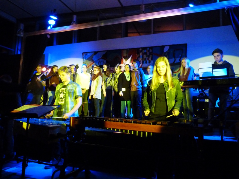 Die Macher hatten nicht zu viel versprochen! Die Gäste erlebten ein mehr als zweistündiges Programm, in dem die Schule einmal mehr ihr ganzes unglaubliches kulturelles Spektrum unter Beweis stellte. Der Schulchor, die Bands Most Wanted und New B.O.R.N., der Profilkurs Orchester, die Lehrerband und der Lehrerchor, der Musikkurs 12 und der Männerchor Viri Reginae, die Klassen 8b und 8f, sowie zahlreiche Solisten und eine Kindergruppe unter Leitung von Schülerinnen waren mit dabei. Alexandra Braband und Dominique Roi hatten die Moderation übernommen. Im Hintergrund wirbelten die Aktiven der Technik AG, der Security und des Catering Teams.