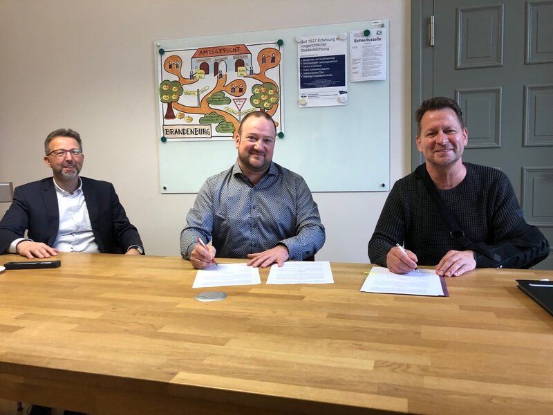 Die Bürgermeister von Birkenwerder und Hohen Neuendorf – Steffen Apelt, Stephan Zimniok und Volker-Alexander Tönnies (v.r.n.l.) – unterschrieben am 4.3.22 die Vereinbarung zum Bus 822.