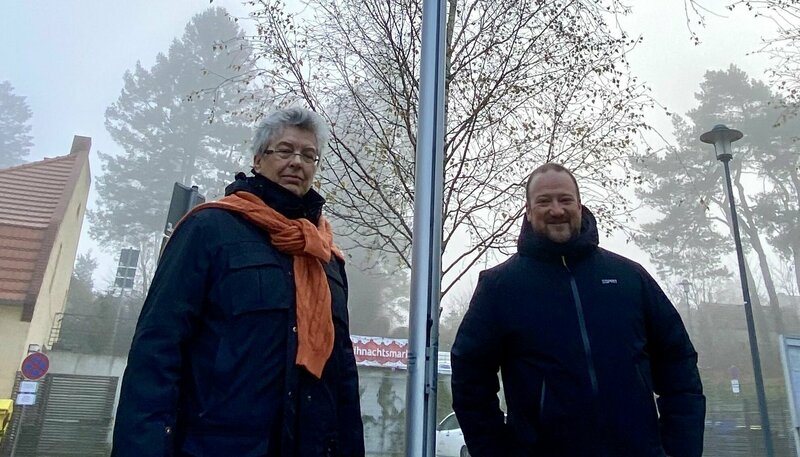 Bildunterschrift: Bürgermeister Stephan Zimniok und die Beauftragte für Menschen mit Behinderung Frau Ute Bartels an der gehissten Flagge