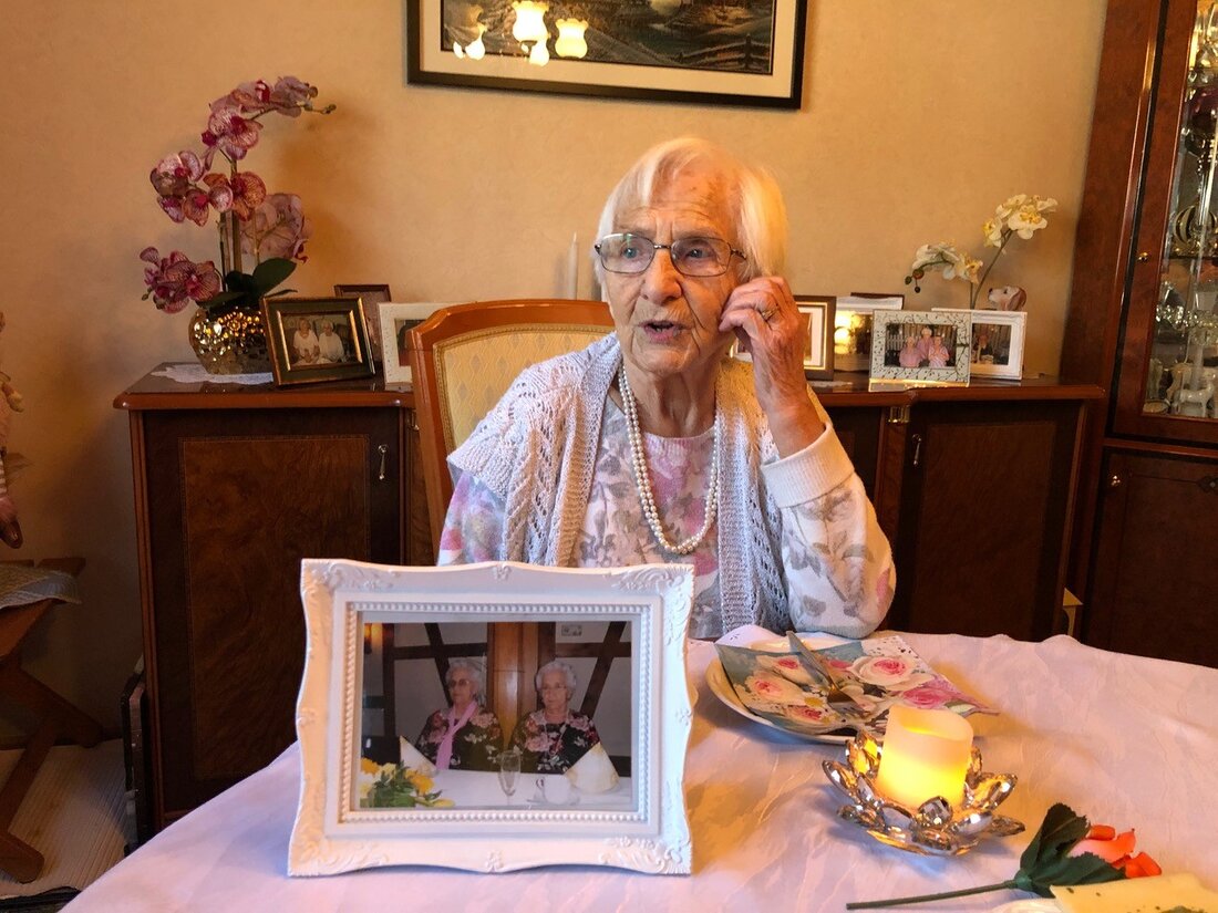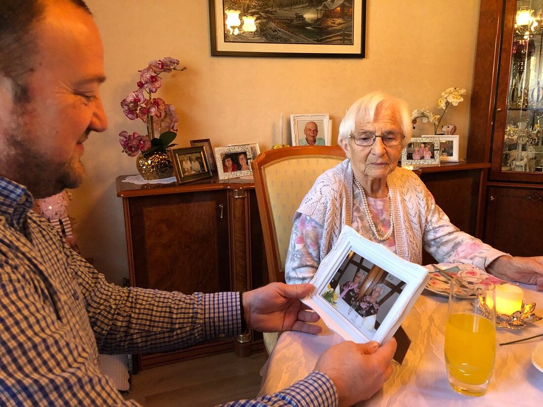 Bild 1: Die 100-jährige Hildegard Kowalewski zeigt Bürgermeister ein Foto von sich und ihrer Zwillingsschwester Erika.