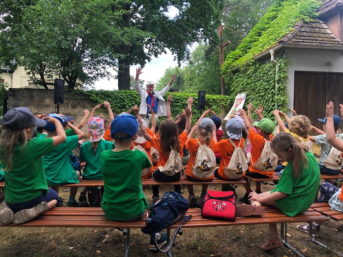 Weil die Vorschulkinder den Bibliotheksführerschein so großartig absolviert haben, gab es als Überraschung des Bürgermeisters und der Gemeinde Birkenwerder ein Abschlussfest für die neuesten Leserinnen und Leser. Der Künstler Wolfgang Rieck alias Musicus-Spiritus begeisterte die Kinder mit einem rund einstündigen Programm. Eingebettet in die Geschichte über das Mädchen Adele, die gerne Ukulele spielt, brachte er den Kindern viele – teilweise kuriose – Instrumente näher und sang mit ihnen viele Lieder. Anschließend überreichte der Bürgermeister die Bibliotheksausweise, Urkunden für die bestandenen Führerscheine sowie einige kleine Überraschungen für die Kinder, die in ihren neuen Bibliotheksrucksäcken Platz fanden. Bei einem Mittagessen vom Grill klang das Abschlussfest im Garten der Clara-Zetkin-Gedenkstätte aus.