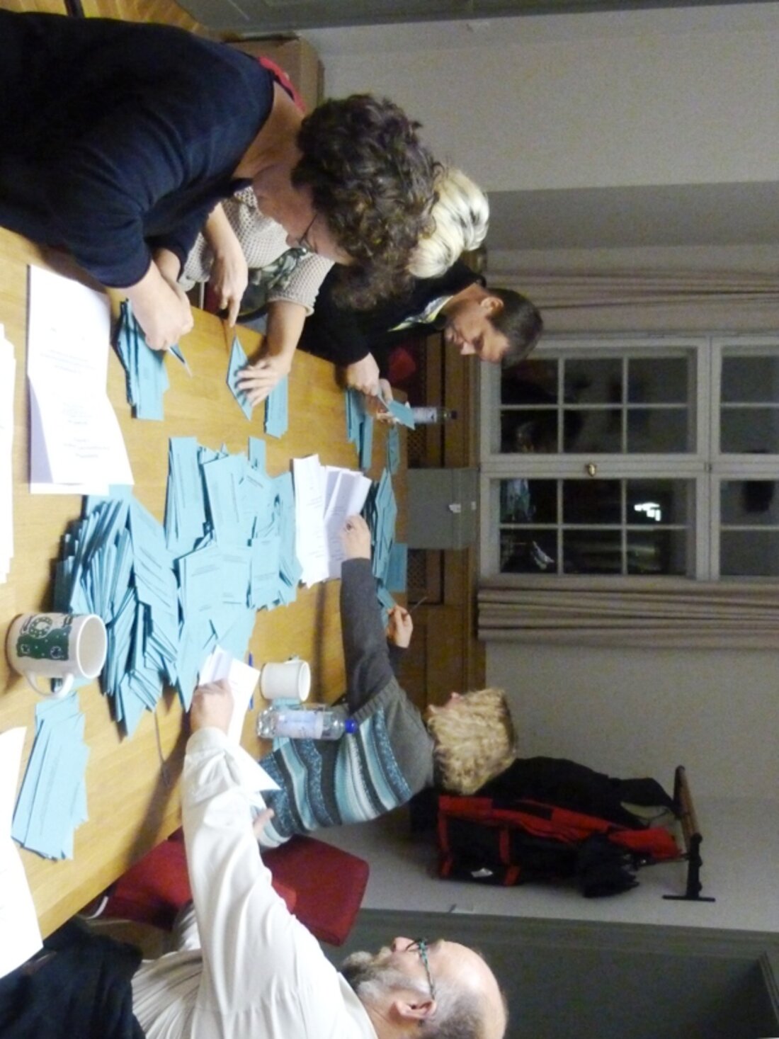 Zahlreiche Gemeindevertreter und Bürger hatten sich nach dem Ende des Urnengangs im 18 Uhr im Ratssaal versammelt, um die Stimmauszählung mit zu verfolgen. Nach nur einer Viertelstunde liegen die Zahlen für ‚Abstimmungslokal 004 Rathaus‘ auf dem Tisch: 226 Stimmen für die Abwahl, 79 dagegen, 5 ungültige Stimmen. Innerhalb weniger Minuten füllen sich weitere Zeilen in der großen Tabelle, die Wahlleiterin Jana Weiß mit Hilfe eines Beamers an der Wand des Saales sichtbar macht. Die Anwesenden rechnen, diskutieren und beobachten gespannt, wie im Nebenraum die Wahlhelfer die 603 Stimmzettel der Briefwähler stapeln. Als die Ergebnisse aus der Kita Rumpelstilzchen reinkommen, steht fest: An den Mehrheitsverhältnissen werden die noch ausstehenden Wahllokale nichts mehr ändern. Einzelne Jubelrufe hallen im Treppenhaus. Nach rund einer halben Stunde ist die Tabelle komplett ausgefüllt: 80,8 Prozent der Wähler und damit 39,2 Prozent der Wahlberechtigten haben für die Abwahl von Norbert Hagen (parteilos) gestimmt. Damit ist das notwendige Quorum erreicht. Die Brandenburgische Kommunalverfassung schreibt vor, dass mindestens 25 Prozent der Wahlberechtigten für die Abwahl stimmen müssen, damit der Bürgermeister abgewählt ist. Die Abstimmungsergebnisse im Einzelnen finden Sie hier: www.birkenwerder.de/aktuelles/neuigkeiten/vorlaeufiges-abstimmungsergebnis-buergerentscheid/.