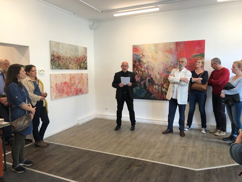 Hartmut Günther, Vereinsmitglied der Galerie 47, freute sich über die zahlreich erschienenen Gäste zur Vernissage der „farbgewaltigen und dynamischen“ Ausstellung. „colour – in motion“ ist als Dialog der Kunst von Evelyn Sommerhoff und Susanne Zinser zu verstehen. Unterschiedliche Sichtweisen und verbindende Ähnlichkeiten werden im Dialog sichtbar. Gemein sei den Werken, dass sie „eine enorme Energie ausstrahlen“, wie Manfred Sekulla in seiner Laudatio verdeutlicht.