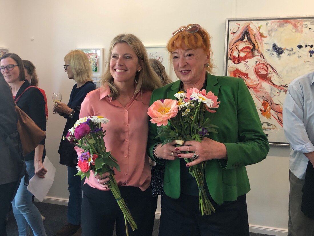 Bild 2: Die Künstlerinnen Susanne Zinser (links) und Evelyn Sommerhoff bei der Vernissage ihrer Ausstellung. Im Hintergrund Werke von Evelyn Sommerhoff.
