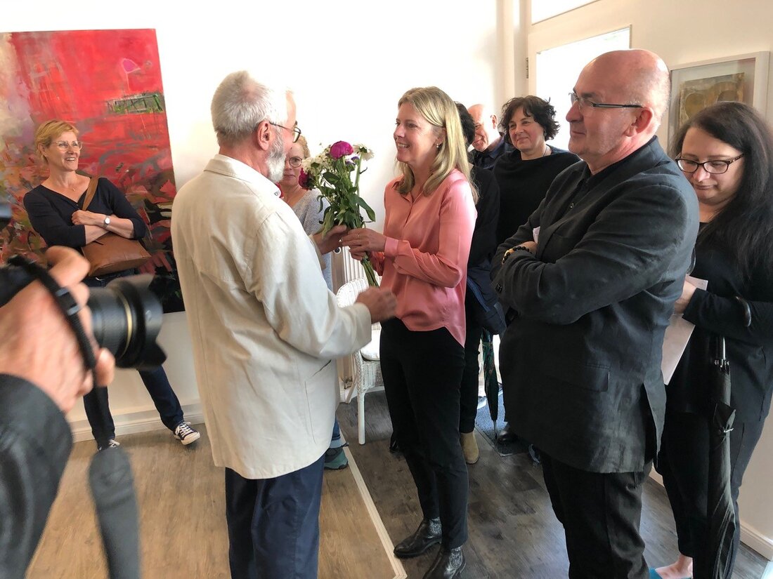 Bild 5: Hartmut Günther überreichte Susanne Zinser Blumen zur gelungenen Ausstellungseröffnung.