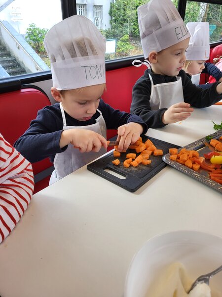 In fünf Gruppen bereiteten die Kinder der Kita Festung Krümelstein verschiedene Gerichte zu. Auf dem Speiseplan standen Powermüsli, Quarkaufstrich, Kartoffelsuppe, Kartoffeln mit Quark und Obstsalat. Dabei erlernten die Kinder den sicheren Umgang mit Messer und Schäler, wie man Kartoffeln viertelt, den Unterschied zwischen Petersilie und Brokkoli sowie alle wichtigen Schritte rund um die Zubereitung von Mahlzeiten, einschließlich der anschließenden Reinigung.