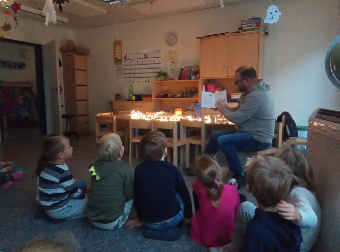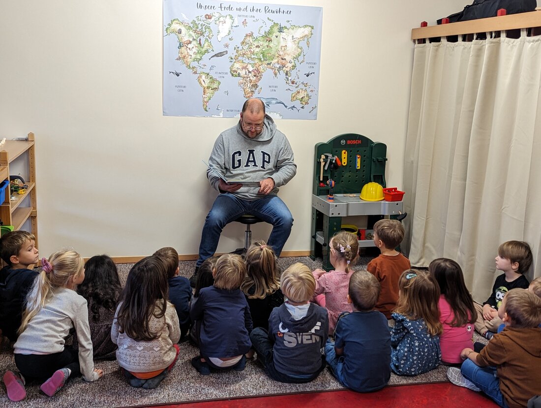 Erfreut empfing Kitaleiterin Susann Unterwalder Bürgermeister Stephan Zimniok am Morgen des Vorlesetages in der Kita Birkenpilz. Aufgeteilt auf mehreren Gruppen las Zimniok den 3- bis 5-Jährigen vor. Dafür brachte er Bücher aus der Gemeindebibliothek mit. Die Kinder der Vorschulgruppe des „Cörnchens“ sind ganz Ohr, als Zimniok aus dem Buch „Die Vulkanos pupsen los“ den Kindern vorliest. Sie hatten sichtlich ihren Spaß, denn natürlich wurde an der ein oder anderen Stelle laut gekichert. Deutlich ist im Raum zu spüren, dass gemeinsames Vorlesen verbindet und Nähe schafft. Doch es kann noch viel mehr, es ist die „wichtigste Voraussetzung, um selbst gut lesen zu lernen und man kann tolle Dinge aus Büchern erfahren“, erklärt der Bürgermeister, den Kindern. Dass den Kindern der Vorlesebesuch Spaß machte, wurde spätestens deutlich als ein Junge „Und jetzt noch eins!“ rief, nachdem der Bürgermeister ein ganzes Buch vorgelesen hatte.