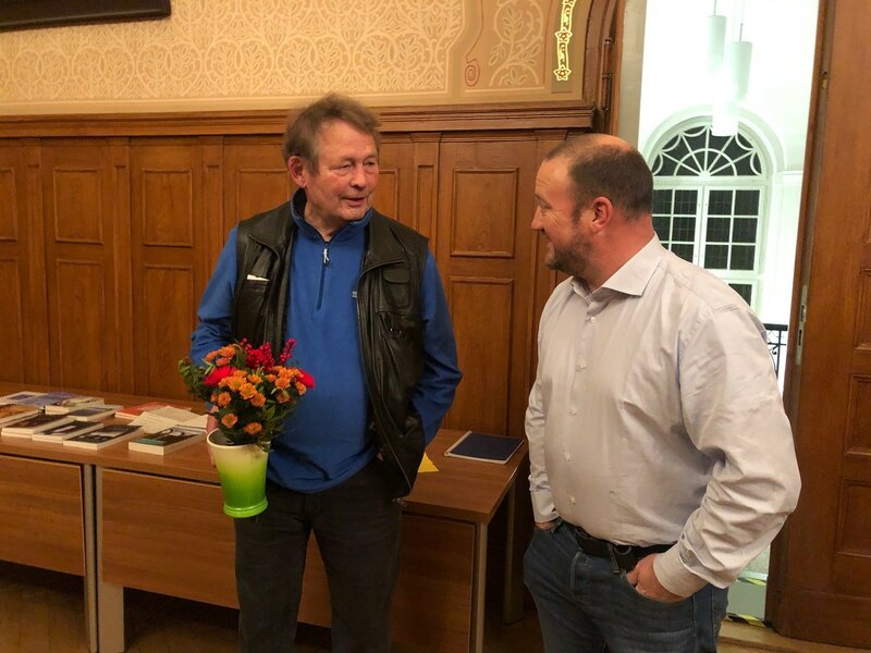Bild 1: Autor Fritz Leverenz (links) und Bürgermeister Stephan Zimniok (rechts) vor Beginn der Lesung im Ratssaal.