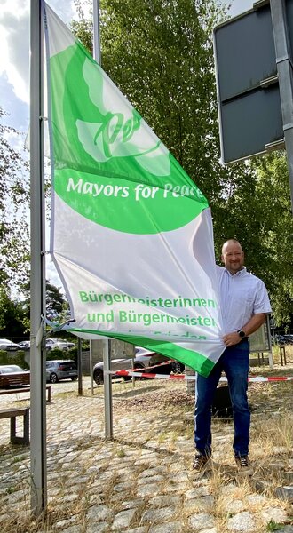 Am 08. Juli 2025 hisst Bürgermeister Stephan Zimniok vor dem Rathaus die „Mayors for Peace“-Fahne als sichtbares Zeichen für den weltweiten Einsatz von Städten und Gemeinden für Frieden und Verständigung.