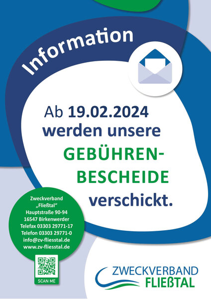 Die Bescheide zur Abrechnung der Schmutz- und Niederschlagswassergebühren für das Jahr 2023 vom Zweckverband „Fließtal“ für Birkenwerder und das Mühlenbecker Land mit den Ortsteilen Mühlenbeck, Schildow und Schönfließ werden ab dem 19.02.2024 versandt. Da der Zweckverband momentan seine Finanzsoftware umstellt, können manche Prozesse eventuell nicht in gewohnter Schnelligkeit durchgeführt werden. Die Mitarbeiterinnen und Mitarbeiter bitten dafür um Verständnis.