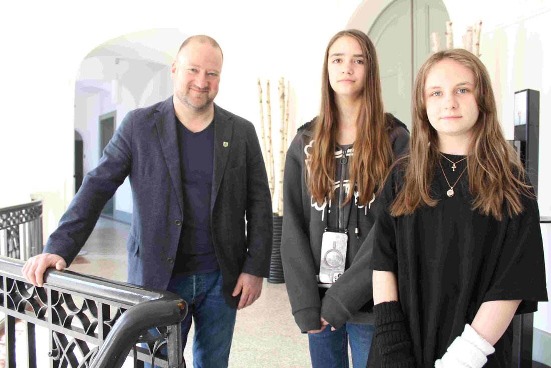 Bild 1: Bürgermeister Stephan Zimniok mit Emily und Felicia (v.l.) im Rathaus Birkenwerder.