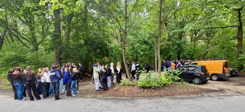 Auch das Forstamt unterstützte die Aktion: Mitarbeiterin Frau Sauer vermittelte den Jugendlichen Kenntnisse über heimische Baumarten und nachhaltige Forstwirtschaft. Für Aufsehen sorgte ein vermeintlicher Waffenfund: Eine der 12. Klassen stieß im Wald auf zwei metallene Gegenstände, die zunächst wie Gewehrteile aussahen. Die Polizei wurde umgehend informiert und übernahm die weiteren Maßnahmen. Vor Ort konnte jedoch schnell Entwarnung gegeben werden – es handelte sich um ausrangierte Gewehrläufe von Luftgewehren, die illegal im Wald entsorgt worden waren.