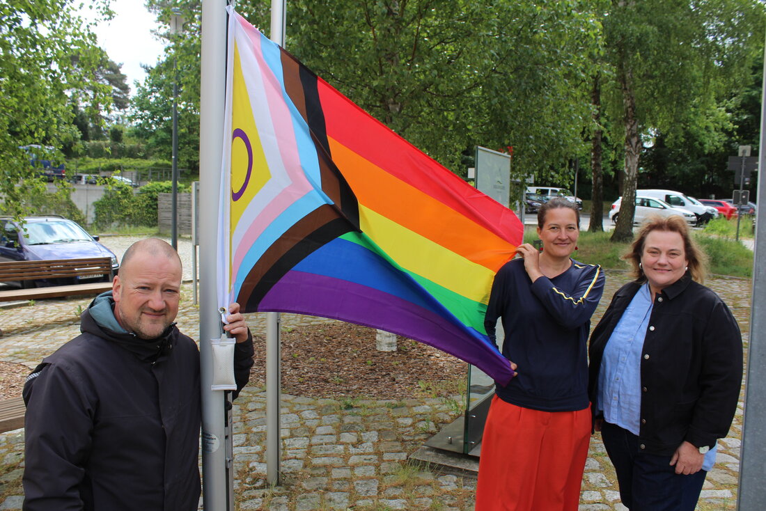Bildunterschrift: Stephan Zimniok, Dr. Constance Raimer und Susanne Kohl (v.l.) hissen am 16. Mai 2025 die Regenbogenflagge am Rathaus Birkenwerder.