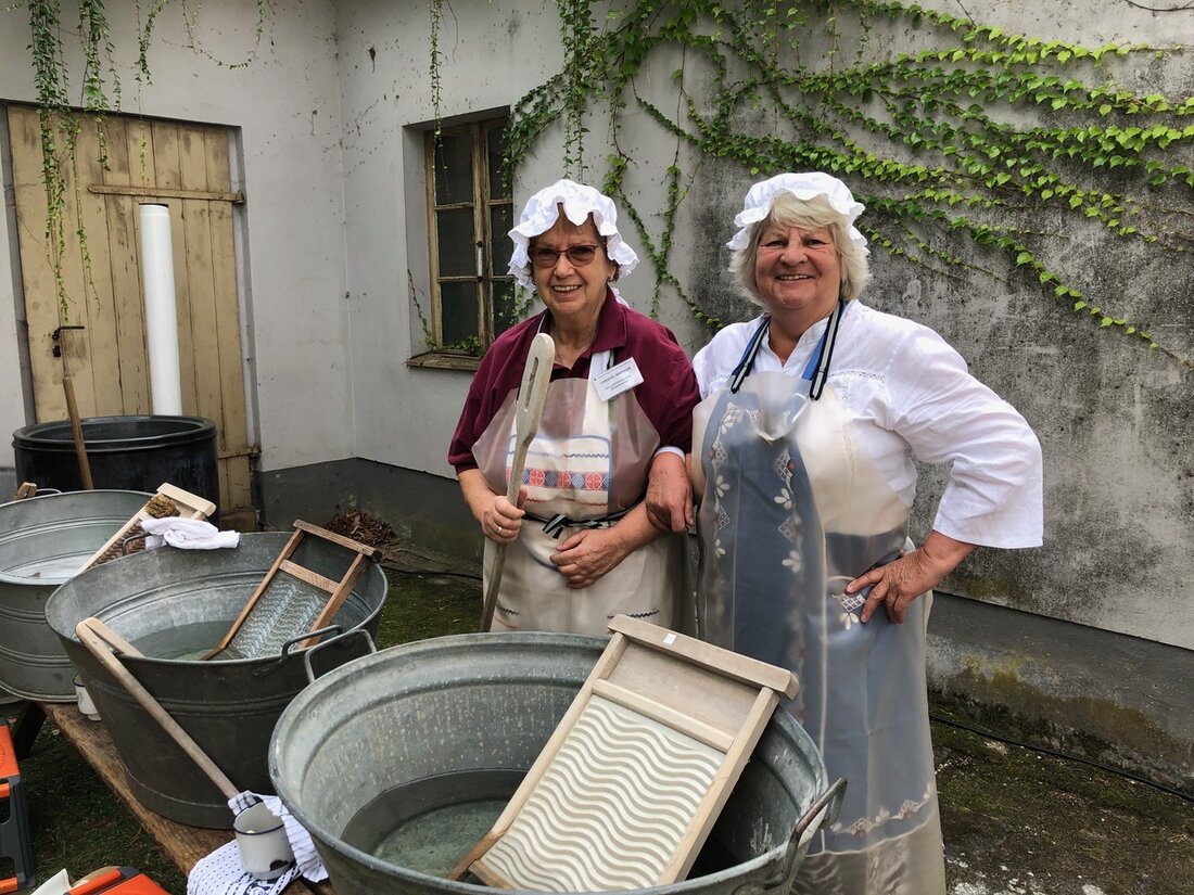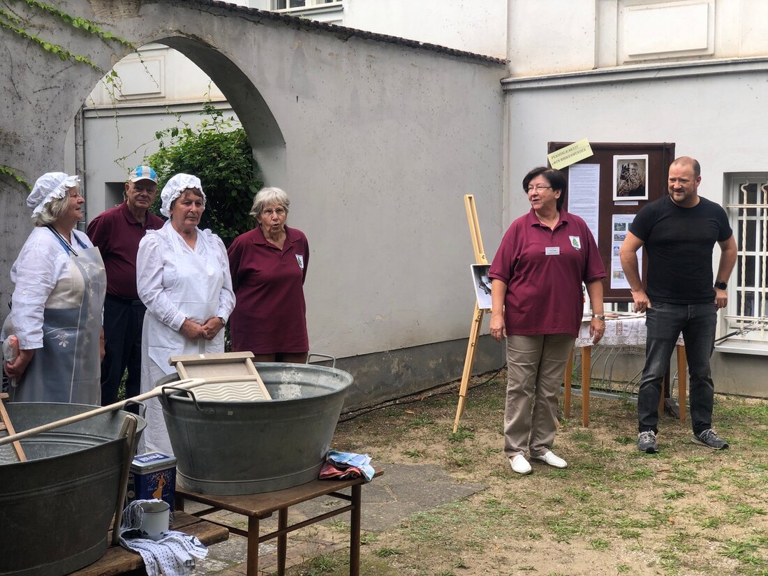 Akkustisch und olfaktorisch wurden am Wochenende die Gäste, unter ihnen Bürgermeister Stephan Zimniok, zum Sommerfest des Geschichtsstübchen gelockt: Nostalgische Leierkasten-Musik der „Drehorgel Klara“ aus Grüneberg und der Duft frisch gebackener Waffeln wehten durch den Garten des Clara-Zetkin-Hauses. Die Waschfrauen des Geschichtsstübchens sangen ihr „Waschfrauen-Lied“ und zeigten interessierten Gästen, wie früher Wäsche gewaschen wurde. Vor allem Kinder zeigten sich immer sehr begeistert und probierten gerne aus, Socken in den großen Bottichen zu waschen, berichtete Gabriele Mebes, eine der Waschfrauen des Geschichtsstübchens. Für die kleinen Gäste gab es außerdem eine Hüpfburg und ein Angelspiel.