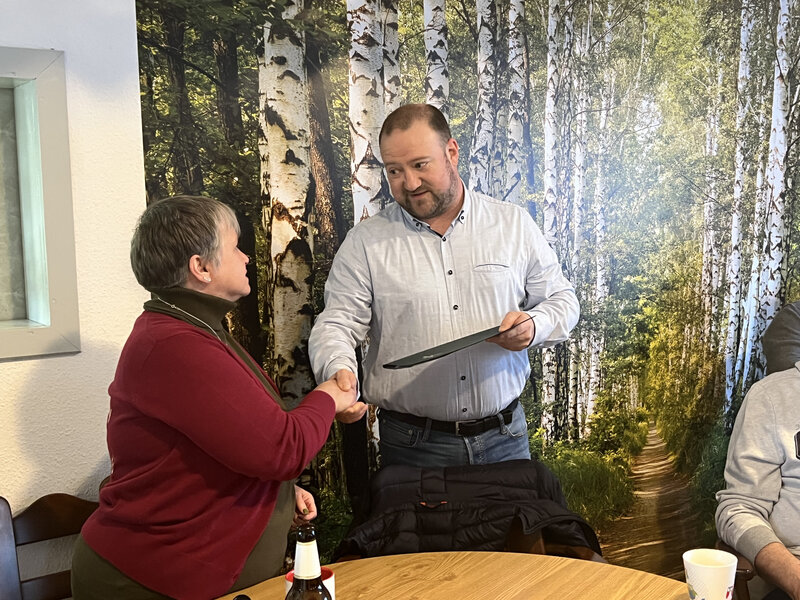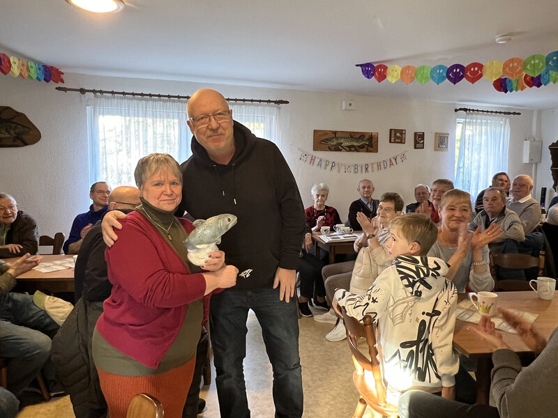 Auch weitere Gratulanten kamen nicht mit leeren Händen: André Stöwe, Leiter der Geschäftsstelle des Kreisanglerverband Oberhavel e.V., brachte einen Gedenkteller in Schatulle; Andreas Behnke, der „Fischer vom Boddensee“ überreichte eine Porzellan-Forelle.