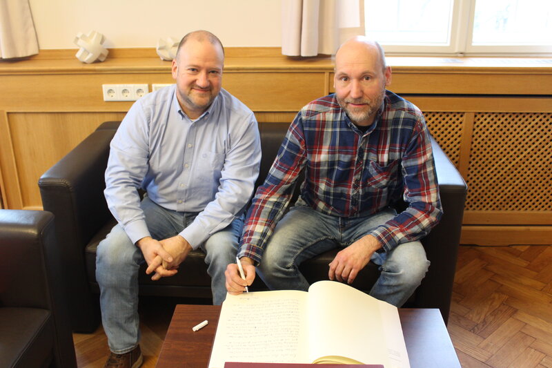 Bildunterschrift: Jens Bartsch (r.) trägt sich im Beisein von Bürgermeister Stephan Zimniok ins Goldene Buch der Gemeinde Birkenwerder ein. Der andere Preisträger Lars Seide möchte sich ebenfalls noch eintragen.