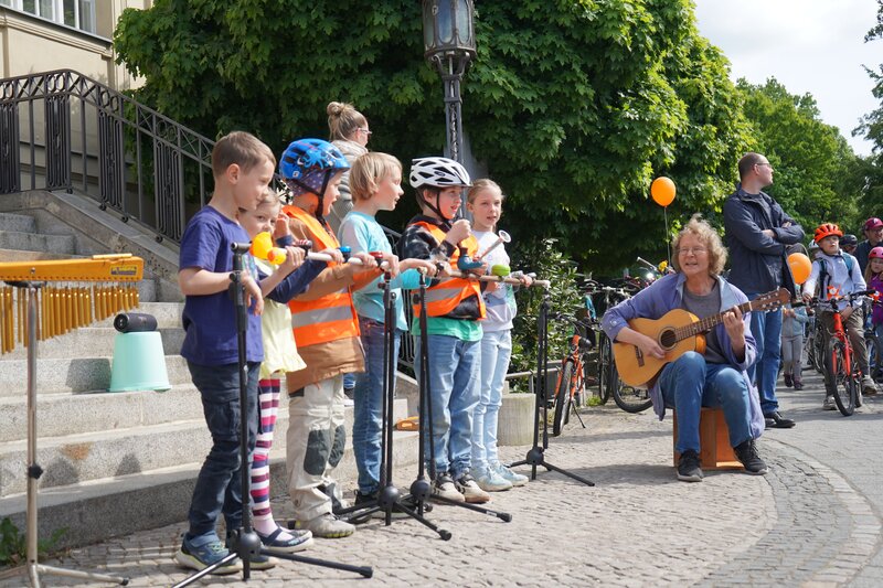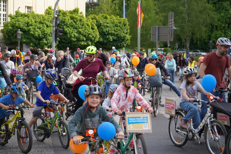 Rund 150 Kinder und Erwachsene demonstrierten am 10.05.2025 bei der "Kidical Mass" für sichere Radwege. "Wie auch im letzten Jahr konnten wir am Samstag, den 10.5. mit 150 Kindern, Jugendlichen und Erwachsenen auf dem Fahrrad von Hohen Neuendorf bis Birkenwerder entlang von 4,5 km abgesperrten Straßen das Radfahren feiern", berichtet Bianca Gebel vom ADFC Birkenwerder. "Mit Polizeibegleitung waren wir unterwegs auf breiten Straßen und konnten ohne Hindernisse kräftig in die Pedale treten. Neben dem Spaß auf dem Rad hatte unserer Fahrradkorso einen ernsten Hintergrund. Ziel war es auf die Bedürfnisse von Kindern und Jugendlichen im Straßenverkehr aufmerksam zu machen. Denn anders als Erwachsene sind Kinder und Jugendliche auf das Fahrrad angewiesen, um sich selbstständig in unserer Gemeinde fortzubewegen", erklärt sie. "Unser Anliegen an eine sichere Infrastruktur für Radfahrende haben wir durch einen Zwischenstopp an der Rathauskreuzung in Birkenwerder kundgetan. Kinder haben Botschaften mit Kreide vor dem Rathaus gemalt und die Kinder der Christenlehre aus Birkenwerder haben mit einem kleinen Ständchen das ganze Programm abgerundet. Am Ende hatte wir alle eine schöne Zeit auf dem Fahrrad und das macht Lust auf mehr im nächsten Jahr."