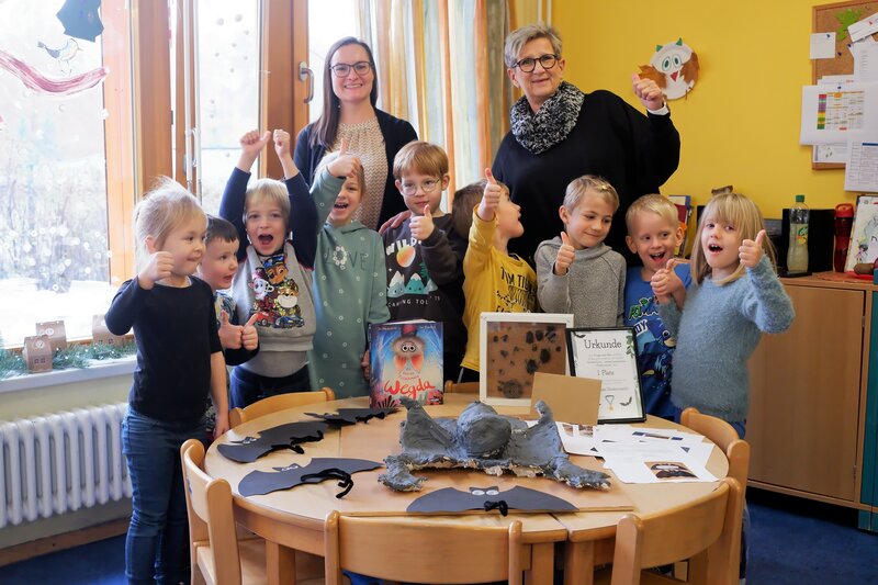 Bildunterschrift: Die Gruppe Blau und Erzieherin Marina Wolke zeigt ihr Fledermausprojekt