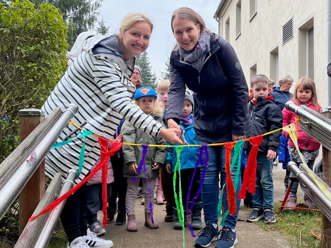 Bild 2: Christine Hentschel, Mitarbeiterin des Fachbereich Bildung und Soziales, und Carina Liebich, Beschafferin der Gemeinde Birkenwerder, zerschneiden das Band und weihen den neuen Kita-Spielplatz ein.