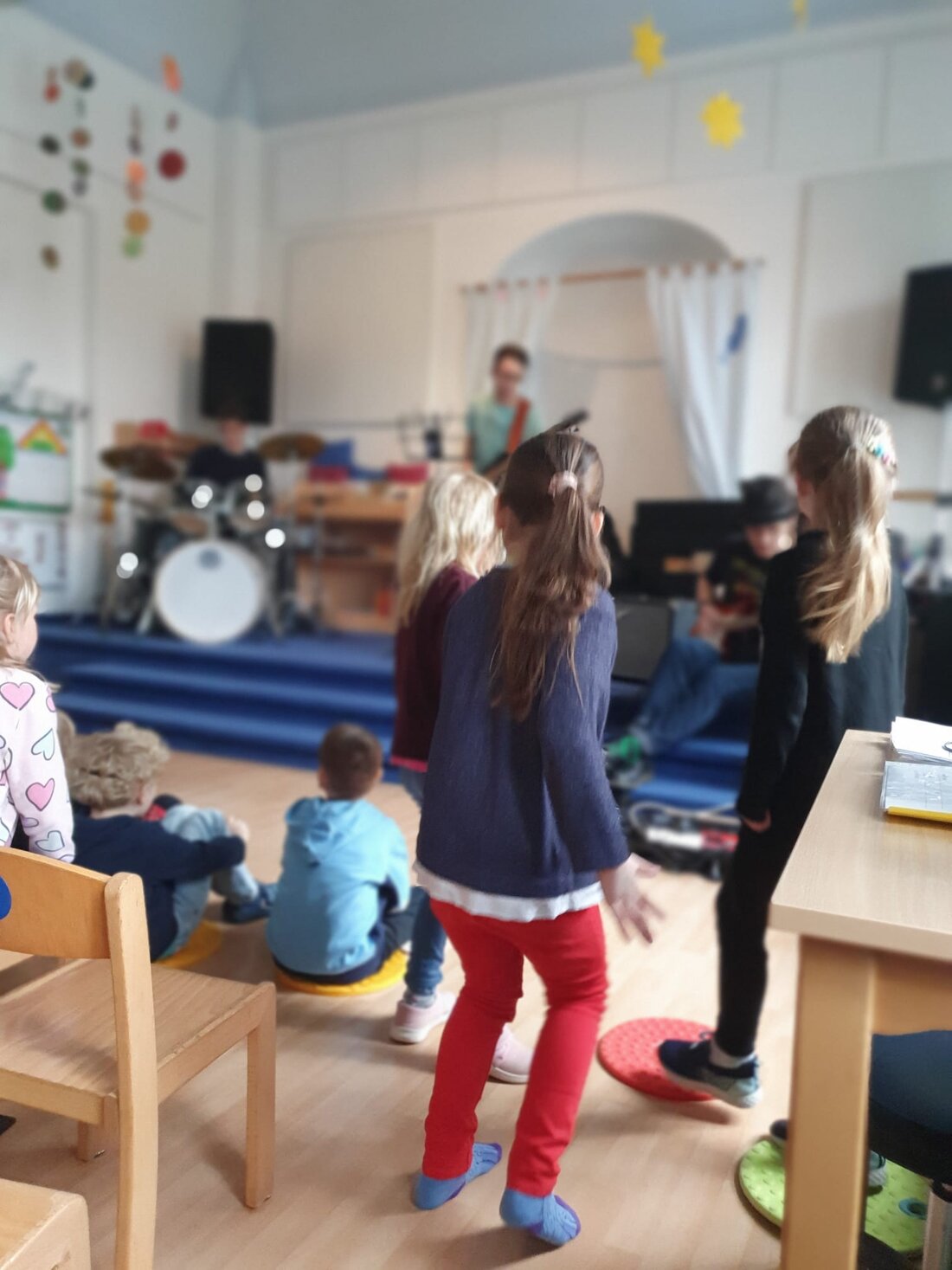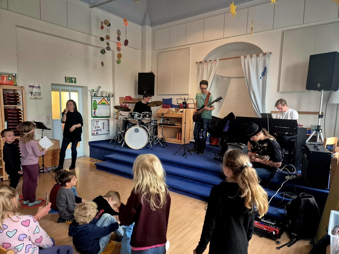 Ein besonderes Highlight war kürzlich der Besuch der Band "The Mixx". Mit vier mitreißenden Musikstücken und Gesang verwandelten die Musikerinnen und Musiker die Kita kurzerhand in eine kleine Konzertbühne. Die Kinder ließen sich nicht lange bitten: Sie tanzten ausgelassen, bewegten sich zur Musik und klatschten begeistert im Rhythmus. Die Freude war ihnen deutlich anzusehen – und auch zu hören. „Das war richtig cool“, rief ein Kind begeistert nach dem Auftritt.