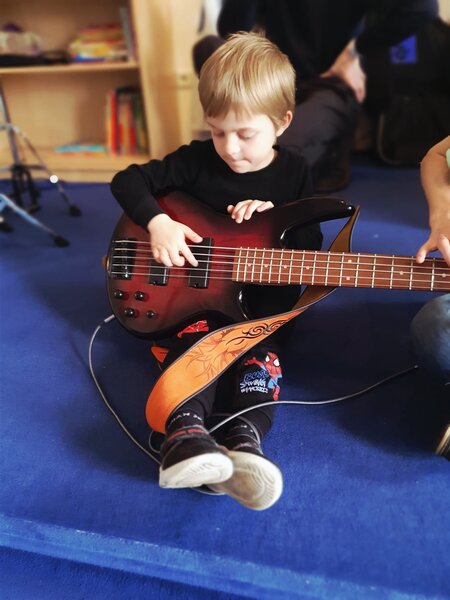 Bild 2: Kinder entdecken die Welt der Musik und probieren begeistert eine E-Gitarre aus.