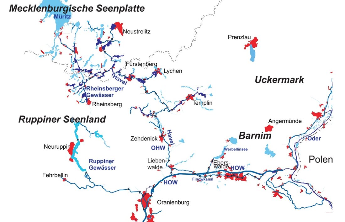 Ein großes führerscheinfreies Wasserrevier mit Marinas, Bootsverleihern und viel Natur: Die Region der Wassertourismus Initiative Nordbrandenburg (WIN) zwischen der Mecklenburgischen Seenplatte und Berlin gehört zu den attraktivsten Wassertourismusrevieren des europäischen Binnenlands. Die WIN widmet sich seit mehr als 20 Jahren dem Ausbau der Infrastruktur – verbindet Reviere miteinander und lässt Schleusen erneuern. Seit Kurzem steht noch ein weiterer Bereich der Infrastruktur im Fokus: die Ladeinfrastruktur für Elektroboote. Um den Wassertourismus nachhaltig weiterzuentwickeln, wird jetzt die Installation öffentlicher Ladesäulen in Marinas finanziell gefördert. Damit werden die Betreiber unterstützt, die Voraussetzung für emissionsfreien – also rein elektrischen – Bootsverkehr zu schaffen. In Oberhavel sollen vier Ladepunkte entstehen. Die Landkreise Barnim und Ostprignitz-Ruppin bereiten vergleichbare Programme vor. Insgesamt zwölf Ladestationen für den Bootsverkehr sollen für ein zusammenhängendes, nutzerfreundliches Netz realisiert werden.