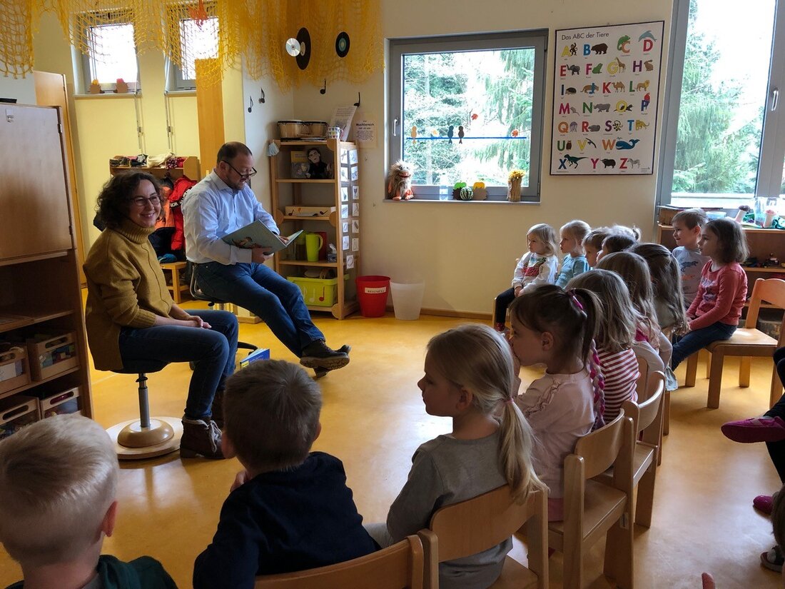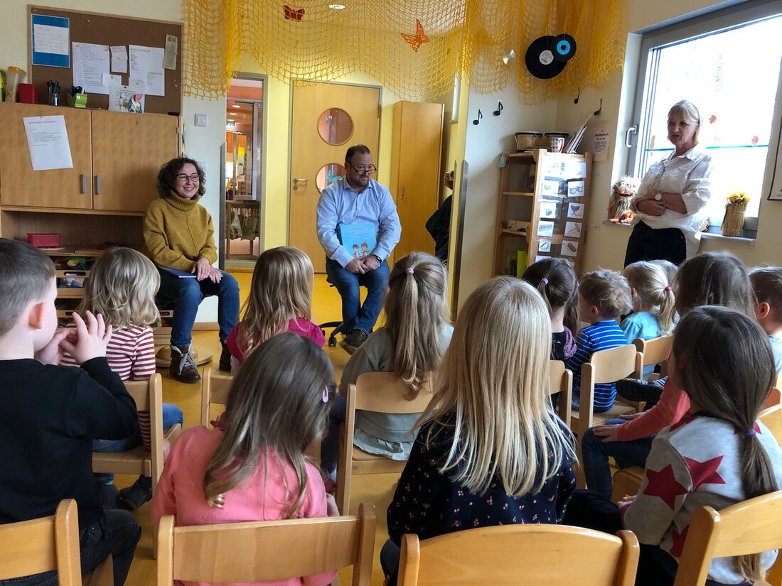Die Landesgleichstellungsbeauftragte Manuela Dörnenburg und Bürgermeister Stephan Zimniok lasen am bundesweiten Vorlesetag Kindern der Kita Rumpelstilzchen Geschichten zum Thema Anderssein vor.