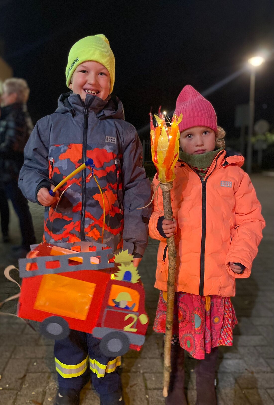 Bild1: Levi und Yoko zeigen stolz ihre selbstgebastelten Laternen