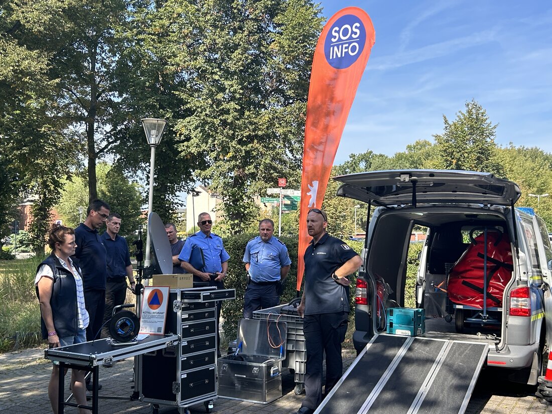 Informationspunkt für die Bevölkerung direkt auf dem Parkplatz der Kreisverwaltung – inklusive Satellitentechnik und Schnellaufbauzelt. Anschließend fand ein Austausch auf fachlicher Ebene statt.