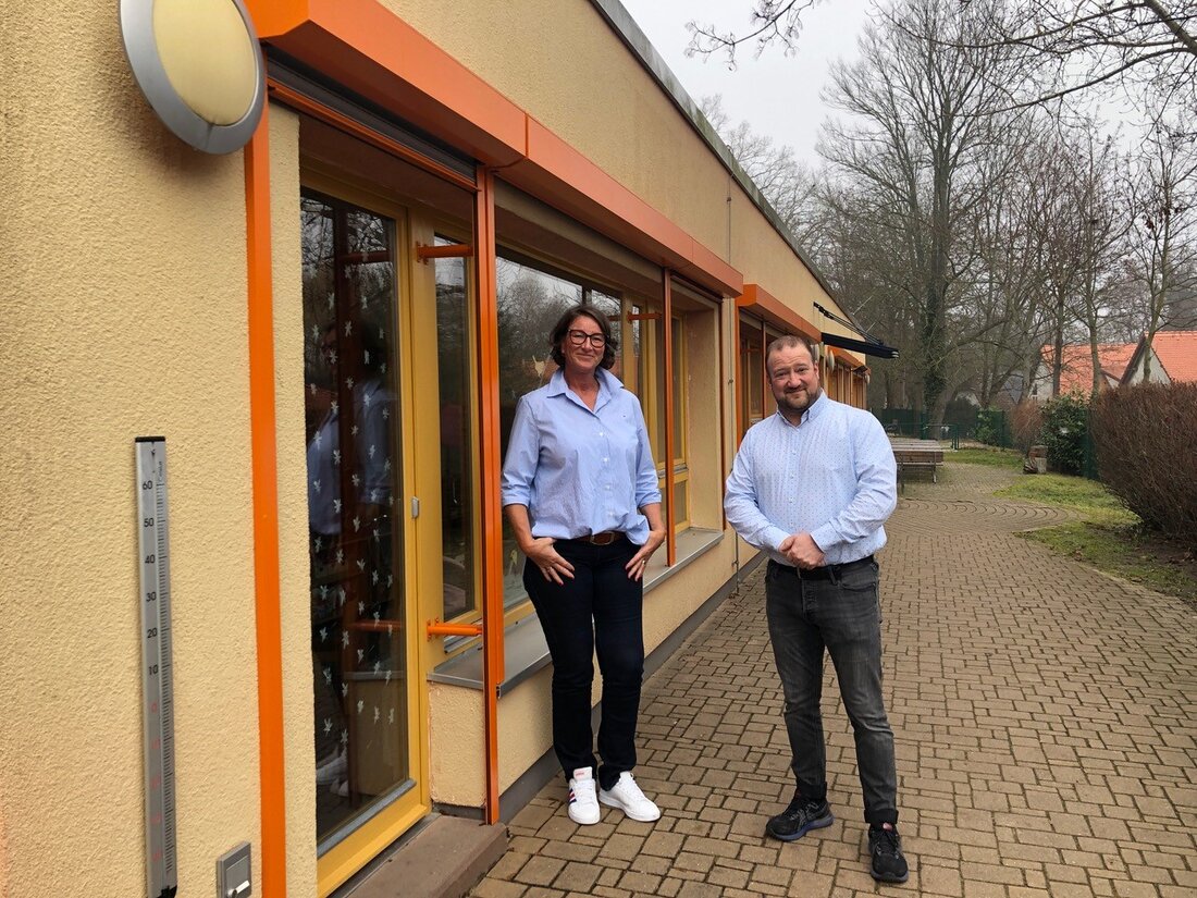 Bild 2: Kitaleiterin Susann Unterwalder zeigt Bürgermeister Stephan Zimniok die neue Jalousie-Anlage.