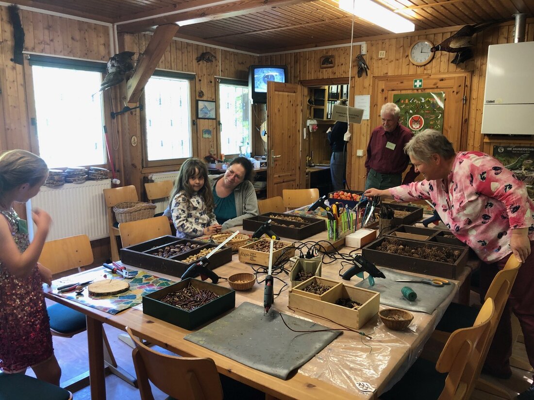 Sehr freundlich wurden am Sonntag bastelfreudige Gäste von Constantin Geilen, Peter und Birgit Marhofer und ihrer Enkelin Leni in der Waldschule Briesetal begrüßt. In gemütlicher Atmosphäre konnte in der Werkstatt der Waldschule mit einer Vielfalt an Naturmaterialien gebastelt werden. Dabei erklärten Birgit Marhofer und Leni, die „eigentlich bei jedem Basteln der Waldschule dabei ist“, bei Bedarf Materialien, Werkzeuge und Abläufe und gaben, wenn gewünscht, auch Bastelideen und -tipps. Als Inspiration diente durchaus auch ein Regal voller gefertigter Basteleien an der Wand des Ateliers. Vorgegebene Motive oder Anleitungen gab es jedoch nicht. „Es kann sich jeder kreativ austoben“, erklärte Vereinsmitglied Birgit Marhofer. Viele, die bereits zum Basteln in der Waldschule gewesen seien, kämen mit ganz konkreten Vorstellungen, was sie basteln wollen, erzählt Birgit Marhofer amüsiert. Das sei ihr vor allem beim Weihnachtsbasteln aufgefallen. Viermal pro Jahr öffnet die Waldschule ihre Werkstatt für Bastelfreudige: zum Muttertags- und Weihnachtsbasteln und im Rahmen der Frühlings- und Herbstfeste. Bei letzteren würde das Basteln besonders gut angenommen und es gäbe meist so viele Interessenten, dass in Etappen gebastelt werden müsse, berichtete Vorstandsmitglied Peter Marhofer. Einen Leerlauf habe er noch nie erlebt, eher im Gegenteil: „Man muss sich dann doch gut koordinieren. Gerade, wenn man mit Kindern bastelt.“ Da müsse man mit den Heißklebepistolen schon aufpassen. Eine Schüssel mit kaltem Wasser stehe immer bereit, beruhigte seine Frau Birgit lächelnd.