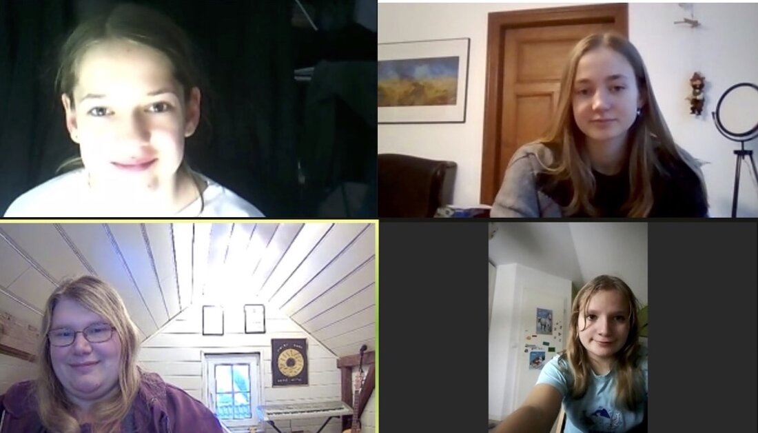 Screenshot: Mitglieder des Kinder- und Jugendbeirats berichten bei einem Zoom-Treffen von ihren Ideen und Zielen (von links oben nach rechts unten: Alina Schäfer, Coreen Toth, Laura Neumann, Miriam Leifheit)