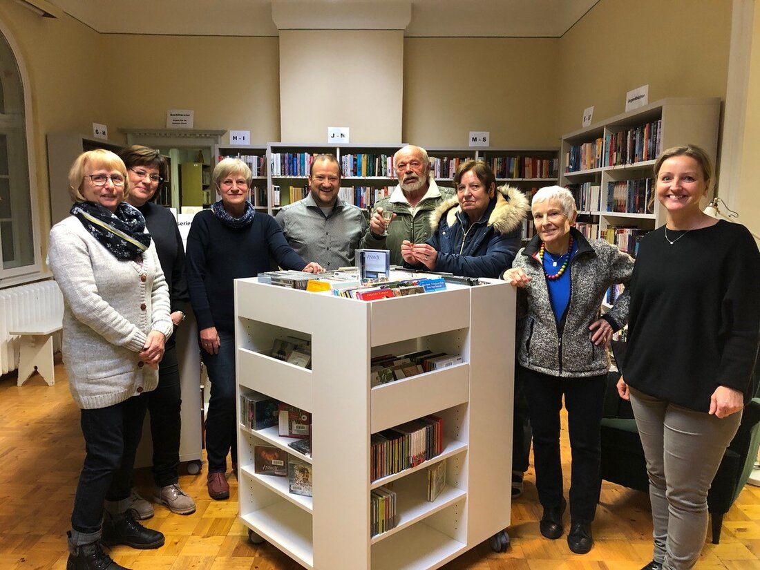 Bild 1: In der Gemeindebibliothek stießen die Bibliothekarinnen Nicole Wölke (2.v.l.), Regina Oergel (3.v.l.) und Bürgermeister Stephan Zimniok (4.v.l.) mit Gästen auf die Neugestaltung der Räume an.