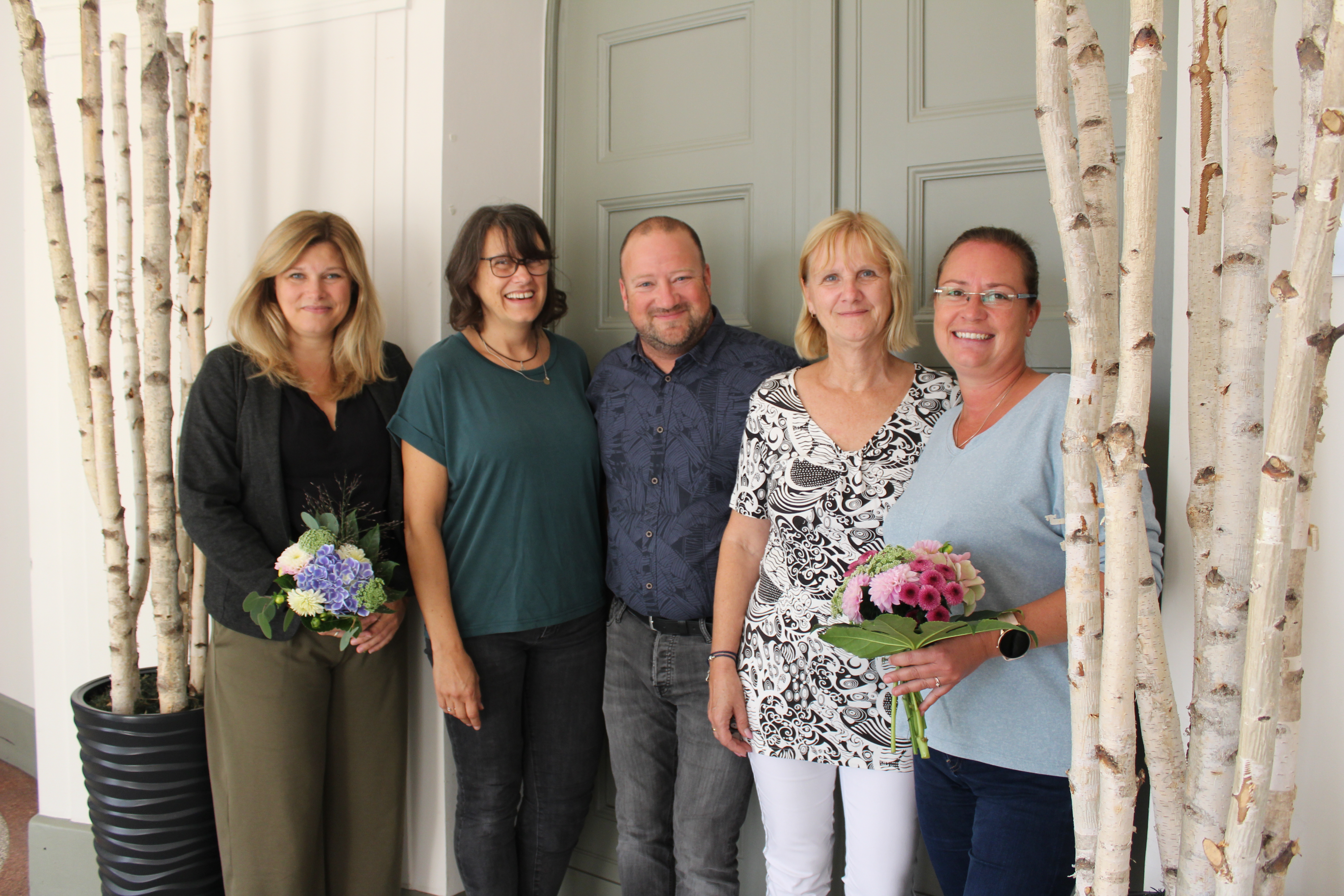 Bildunterschrift: Bürgermeister Stephan Zimniok überreichte Blumen an die künftigen Einrichtungsleiterinnen. Von links nach rechts: Jouana Maetsch, Christiane Baierl, Stephan Zimniok, Kathrin Roggan und Anja Paulick.
