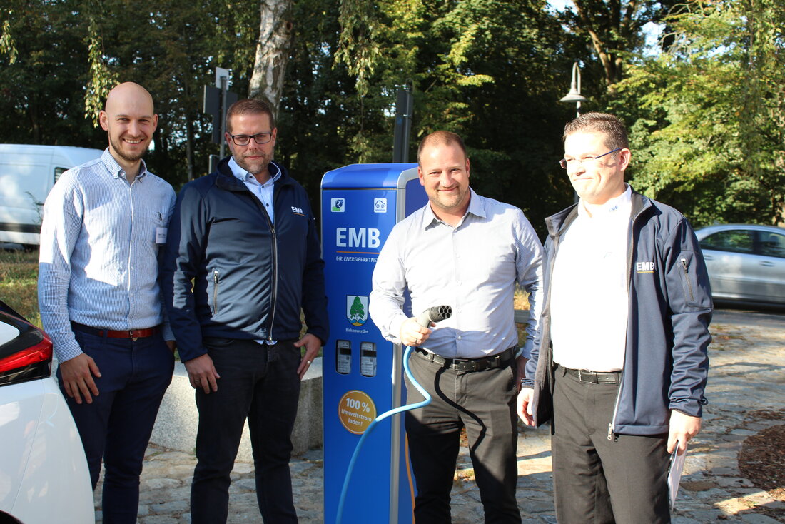 Bildunterschrift: Klimaschutzmanager Martin Thiele, der EMB-Regionalleiter Matthias Braksch, Bürgermeister Stephan Zimniok und Manuel Toplak (EMB) bei der Einweihung der neuen Ladesäule auf dem Rathausparkplatz