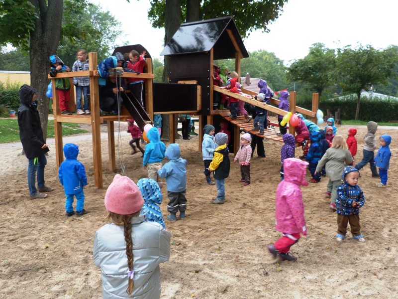 In den vergangenen Tagen hatten die Kleinen erwartungsvoll um die Absperrung gestanden und den Aufbau der neuen Geräte beobachtet. Bis zum Einweihungsfest am Mittwoch sollten sie sich gedulden. Klar, dass das dann auch bei Dauerregen stattfinden musste.