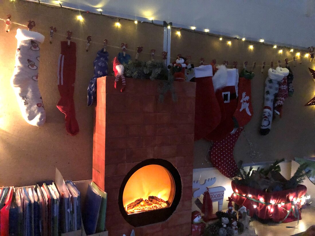Bild 3: Adventskalender und ein digitales Feuer im Kamin sorgen für besinnliche Stimmung im Klassenraum.