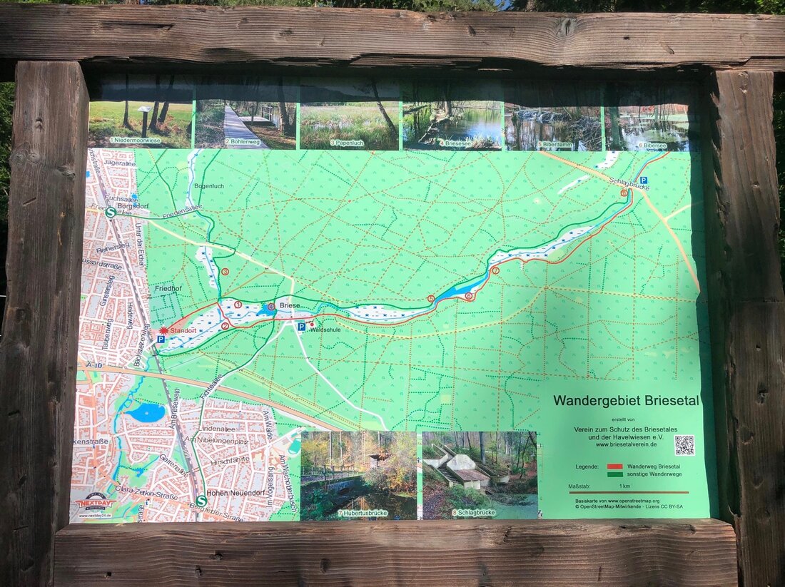 Die neue Wanderkarte dient den Hauptzielen des Briesetal Vereins: Naturschutz und Erziehung zur Achtsamkeit vor der Natur. Sie zeigt das Wandergebiet Briesetal, Orientierung geben dabei die abgebildeten S-Bahnhöfe Borgsdorf und Birkenwerder. Die acht Sehenswürdigkeiten Niedermoorwiese, Bohlenweg, Papenluch, Briesesee, Biberdamm, Bibersee, Hubertusbrücke und Schlagbrücke sind auf der Karte markiert und durch Fotos illustriert. Ein QR-Code verweist für mehr Informationen auf die Homepage des Briesetal Vereins.