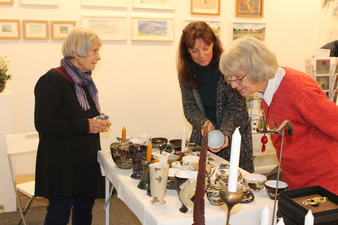 Was gibt es Schöneres als ein Geschenk, das einzigartig ist? In der Kommunalen Galerie 47 in Birkenwerder hat sich kurz vor Weihnachten, am 20. Dezember 2024, noch einmal die Gelegenheit zum Kauf geboten. Künstlerinnen und Künstler aus der Region präsentierten ihre Werke. Das Angebot reichte von Keramik über Kinderbücher bis zu Malereien. Mit dabei waren unter anderem Frauke und Jürgen Gerhard, Elli Graetz, Zhanna Oliinyk-Makii und Elinor Weise. Die Mitglieder des Vereins, der die kleine Galerie in der Hauptstraße 47 betreibt, sorgten darüber hinaus für ein gemütliches Beisammensein mit Plätzchen und heißen Getränken. Sowohl für die Besucher, als auch für die Künstler war der vorweihnachtliche Abend eine inspirierende Gelegenheit, miteinander ins Gespräch zu kommen – über die Kunst, aber auch über andere Themen. Schon kurz nach der Eröffnung um 17 Uhr waren die kleinen Räume gut besucht.