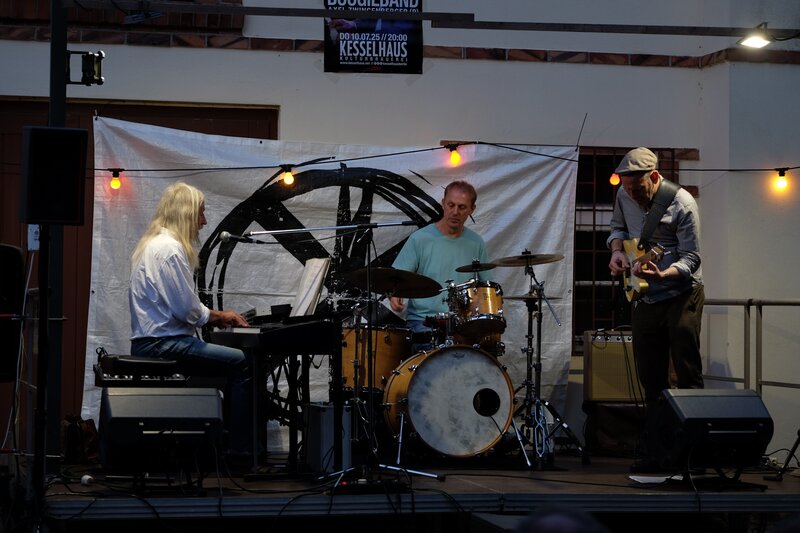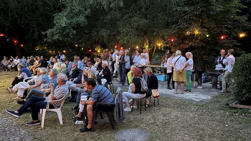 Auf dem Hof der EMB Energie Brandenburg GmbH (EMB), direkt am Skulpturenboulevard gelegen, spielte die Piano Schulze Boogie Band, die mehr als 110 Gäste mit Blues, Boogie-Woogie und Ragtime begeisterte. Dazu gab es gekühlte Getränke und Kulinarisches vom Grill unter Bäumen geschmückt mit bunten Lichterketten, organisiert von Mitgliedern des Vereins.