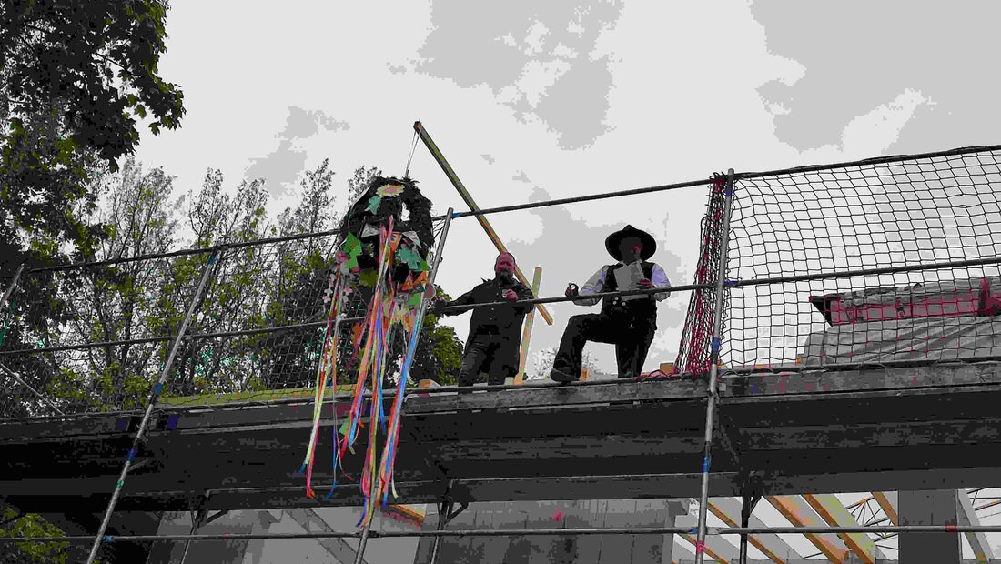 Bild 1: Bürgermeister Stephan Zimniok und Dachdecker Nico Luchterhand an der von Kindern geschmückten Richtkrone.