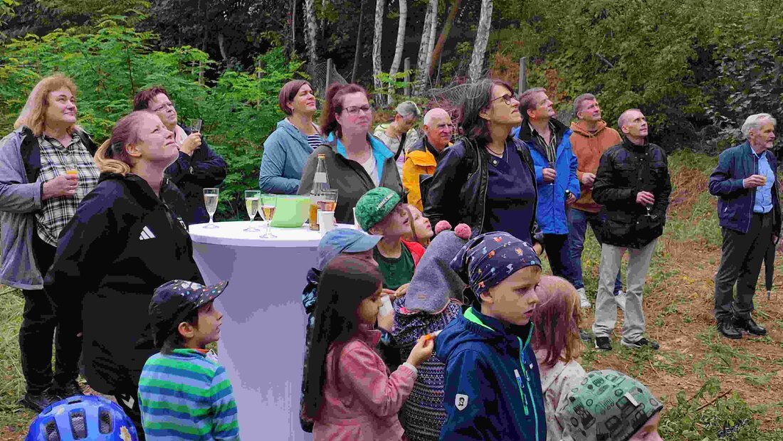 Bild 2: Staunende Besucher der Richtzeremonie richten ihren Blick zur Richtkrone.