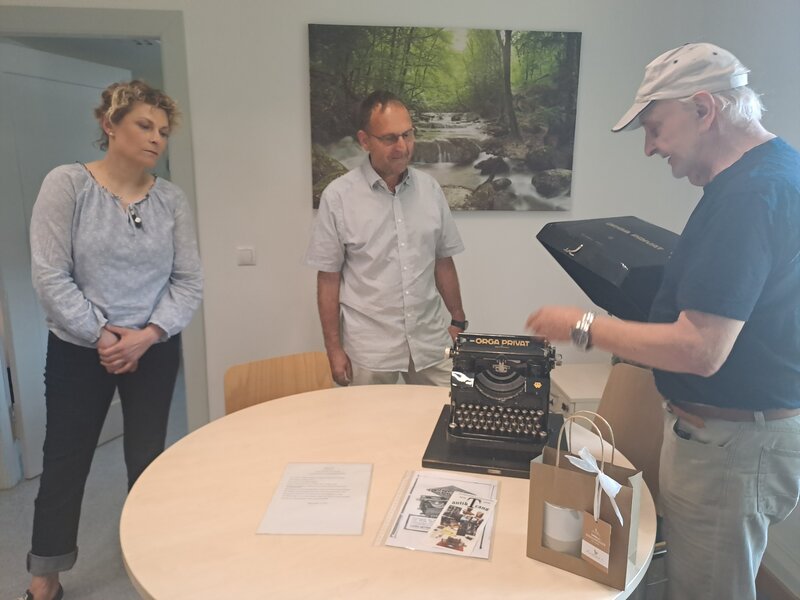 Am 17.07.2023 erfolgte die Rückgabe der Schreibmaschine an die derzeitige Friedhofsverwalterin, Cathèrine Brauner, und an den stellv. Bürgermeister, Jens Kruse. Ein geeigneter Platz für das Schmuckstück steht noch nicht fest, eventuell verbleibt sie in der Friedhofsverwaltung oder wird dem Geschichtsstübchen übergeben.