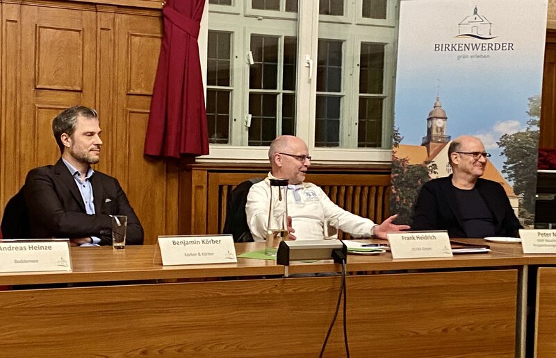 Bildunterschrift: Benjamin Körber -Körber&Körber, Frank Heidrich - Eltav GmbH und Peter Milde - KMP Bauplanung, beim Runden Tisch der Wirtschaft in Birkenwerder